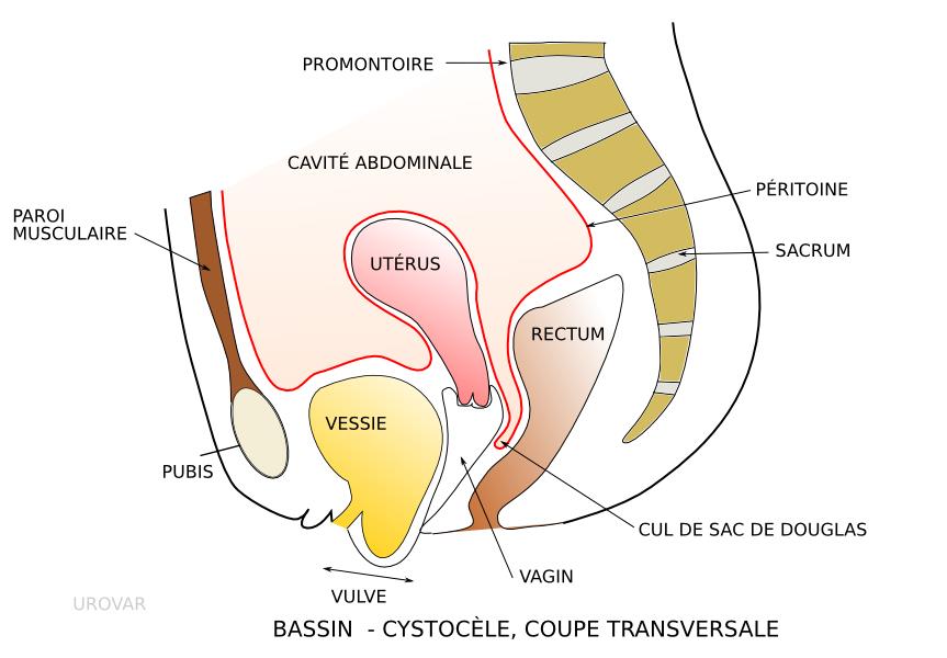 Il s’agit d’une descente de la vessie dans le vagin, la paroi du vagin s’étire pour laisser la place à la vessie. Les principaux symptômes sont : impression de masse ou de pression dans le vagin, sensation d’irritation dans le vagin, impression de ne pas bien vider sa vessie. La cystocèle peut s’accompagner d’incontinence urinaire, c’est-à-dire de pertes d’urine involontaires. L’incontinence et la descente de la vessie ne sont pas toujours ensemble et ne se traitent pas de la même manière.