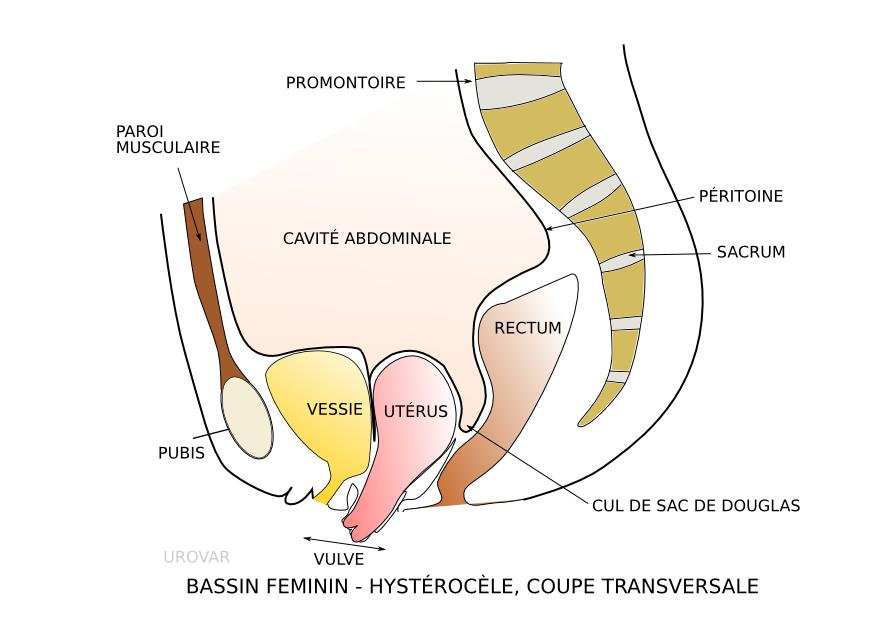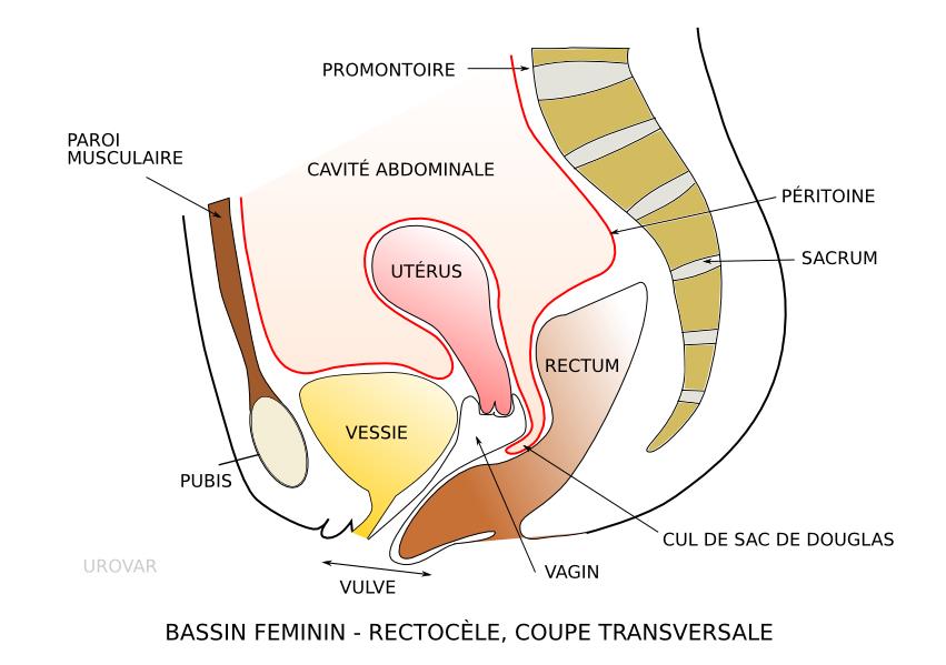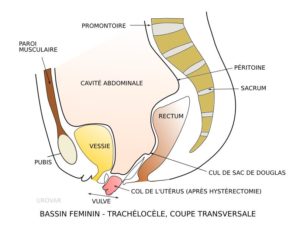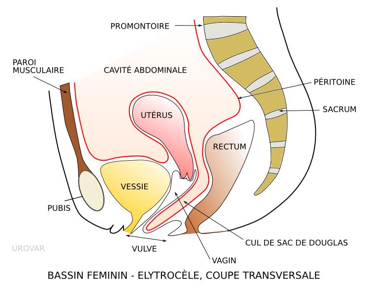Elytrocèle: cul de sac de Douglas, c’est à dire la partie entre l’utérus et le rectum où l’on retrouve généralement des anses intestinales (paroi postérieure du vagin).