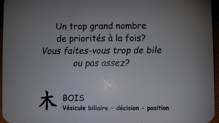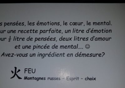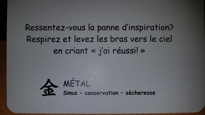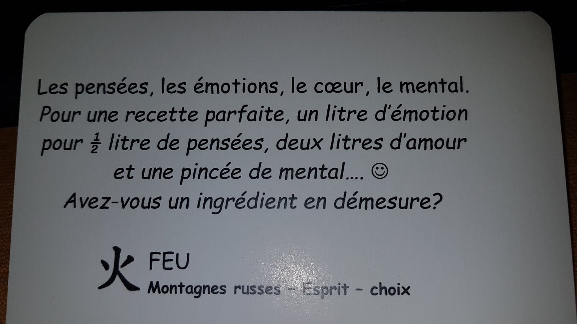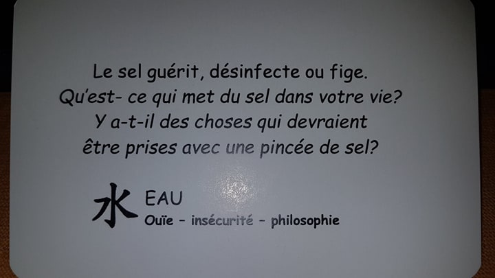 -Ayez en main votre jeu. Que ce soit pour un message, une réflexion ou par curiosité, prenez le temps de découvrir son message. Il vient de l’énergie des Cinq Éléments; il vous transmet leur sagesse et vous invite à la réflexion. Laissez-vous porter par le geste de votre main.